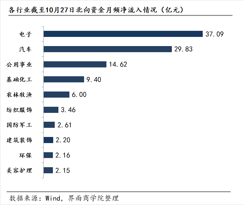 以申万31个一级行业为基准,截至10月27日的月频申万一级行业数据显示,北向资金流入显著的前三板块分别为电子、汽车以及公用事业,月流入分别为37.09亿元、29.83亿元和14.62亿元。而北向资金撤出的前三板块分别为电力设备、食品饮料以及医药生物,月流出分别为110.55亿元、92.63亿元与58.56亿元。
