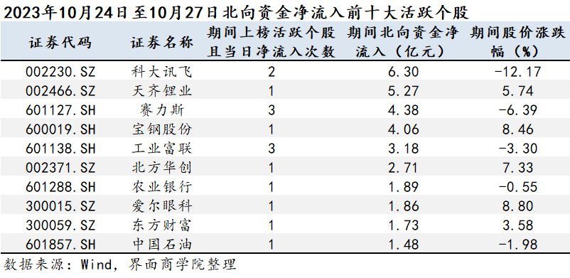 从北向资金活跃个股净流入金额上看,科大讯飞(002230.SZ)、天齐锂业(002466.SZ)、赛力斯(601127.SH)为10月第四周北向资金净流入的前三。