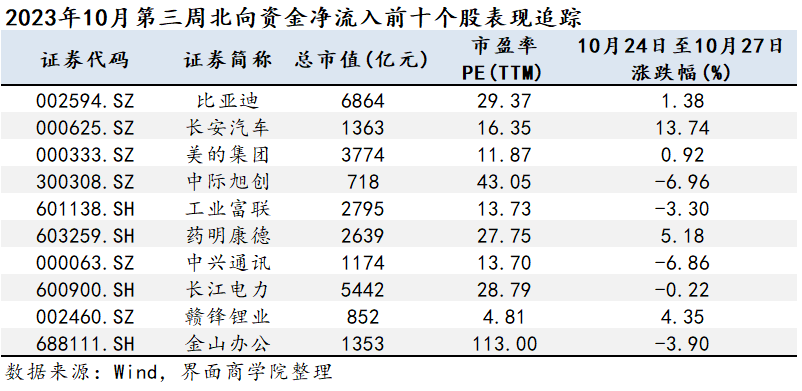 下图为上期2023年10月第三周北向资金净流入前十大个股的后续表现情况。数据截至2023年10月27日,追踪区间为2023年10月24日至10月27日。排序以上期资金净流入为基准。