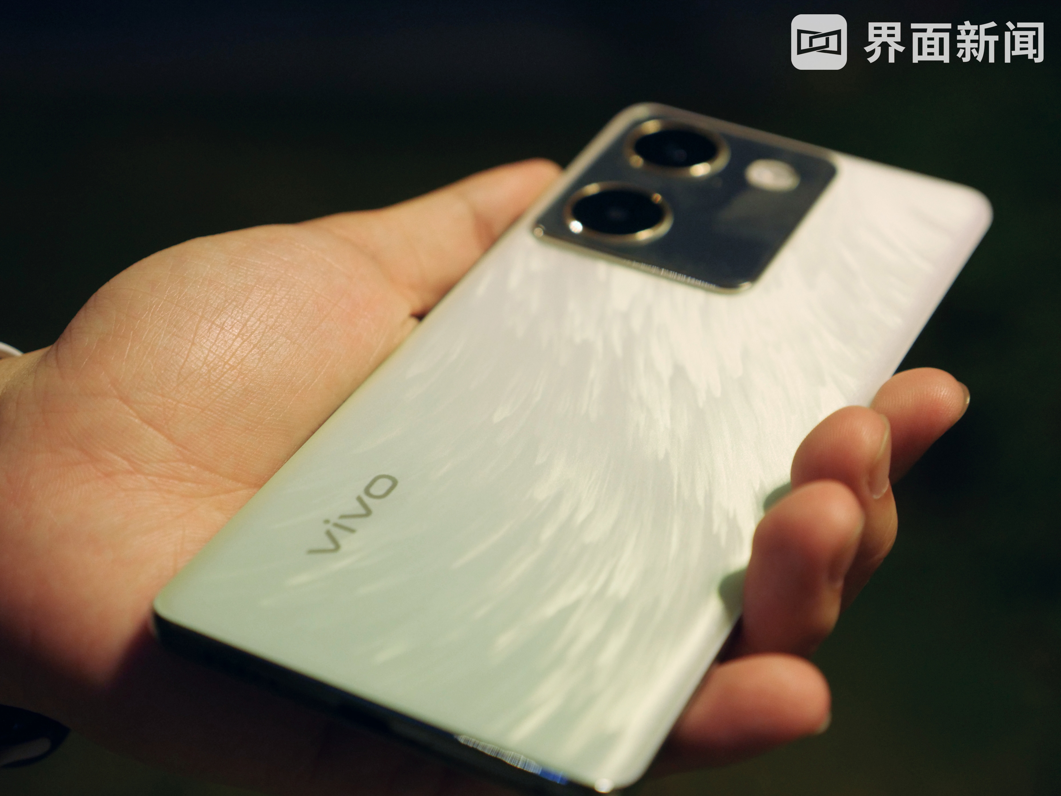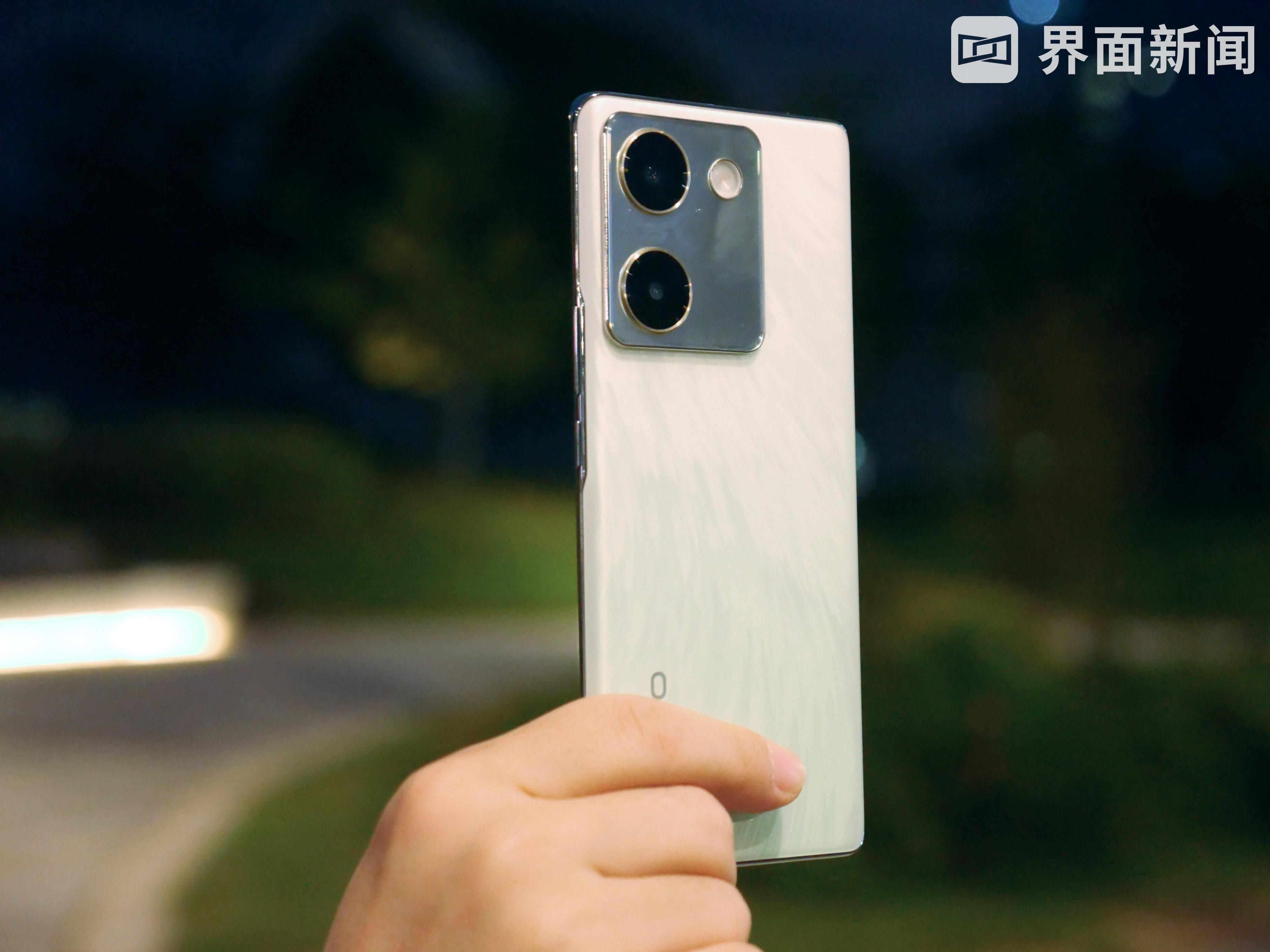 设计,是vivo Y100的第一个差异化所在。我手上的配色名为“琉云青”,从命名就不难看出,新机试图强调一种“东方美学”的意味。整机的后盖接近乳白色,但vivo还加上了类似泼墨水彩的效果,在不同光线下会呈现出不一样的观感,从后盖来看是拥有一定辨识度的。