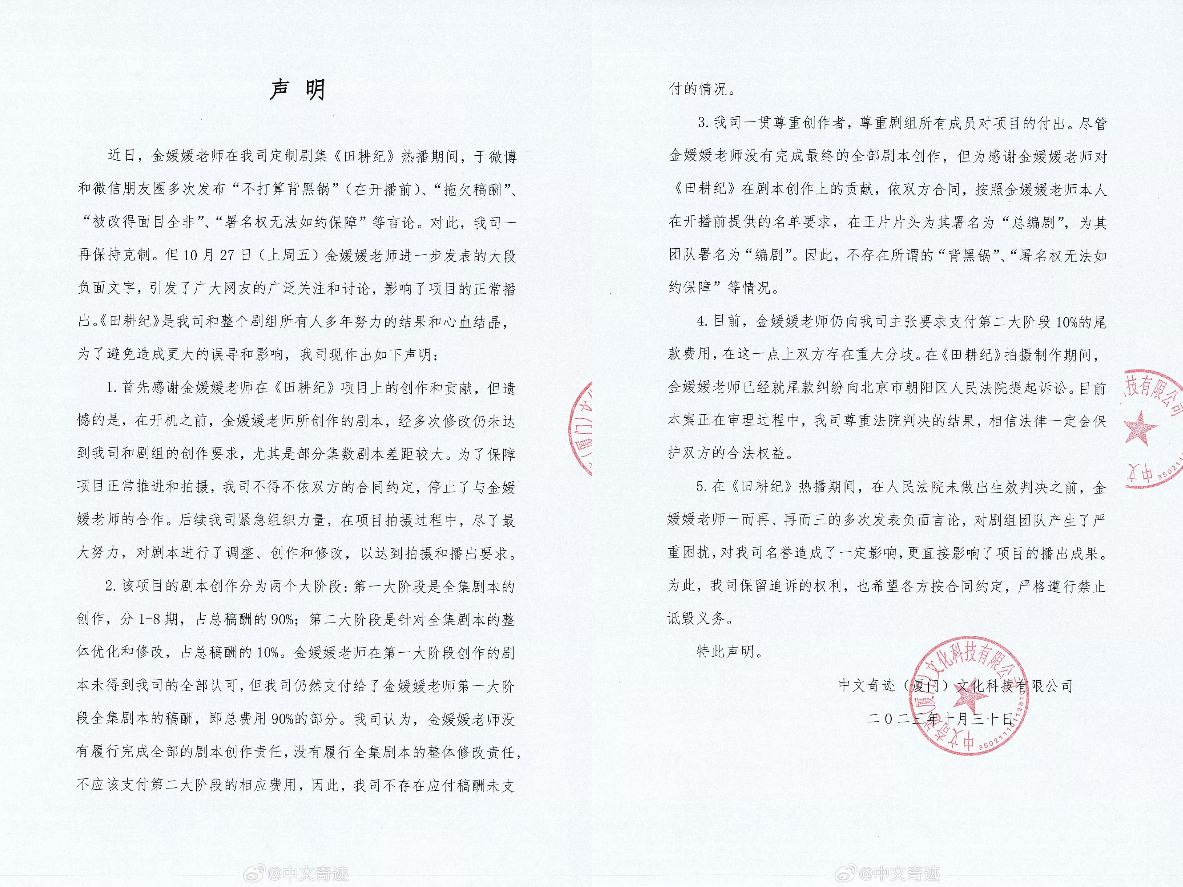 10月30日,《田耕纪》出品方中文奇迹发声明回应编剧问题。中文奇迹称,开机之前,金媛媛所创作的剧本经多次修改仍未达到公司和剧组的创作要求,为不影响正常拍摄,依合同停止合作,后期中文奇迹对剧本进行了调整、创作和修改,以达到拍摄和播出要求。