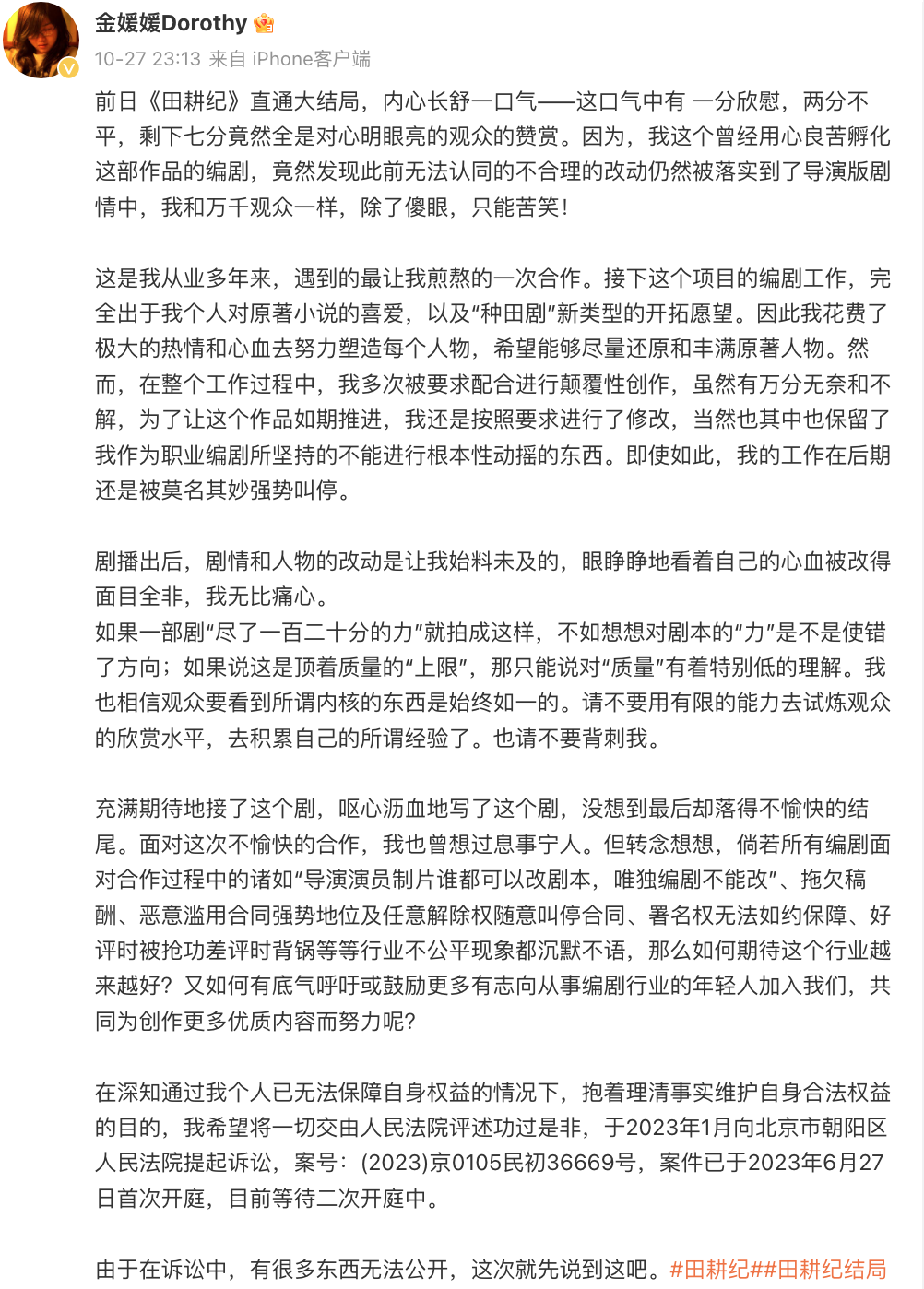 10月27日,《田耕纪》编剧金媛媛在微博、豆瓣等平台发文称,剧组随意修改剧本、拖欠稿酬,同时剧方“恶意滥用合同强势地位及任意解除权随意叫停合同”,编剧署名权无法如约保障,“好评时被抢功差评时背锅”。