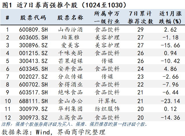 上图将券商近7日(10月24日至10月30日)推荐的个股按被推荐次数由高到低排序。共有763只个股得到券商周内多次推荐,81只个股被券商推荐10次以上, 12只个股被券商推荐20次以上。其中山西汾酒(600809.SZ)在过去一周得到29次券商的集中推荐。