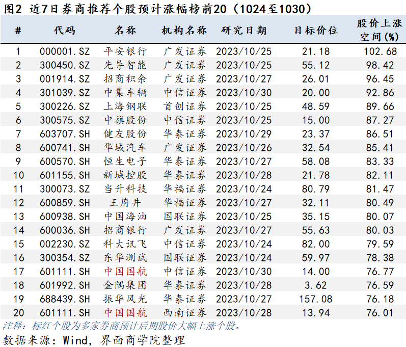 上图将券商近7日(10月24日至10月30日)推荐的个股按预期股价上涨空间由高到低排序,股价上涨空间计算基数均以最新交易日收盘价为准,其中券商目标价通常指未来3至6个月券商预测目标价。其中,广发证券预测平安银行(000001.SZ)股价后续上涨空间为102.68%。