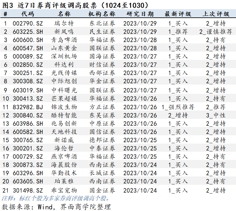券商对上市公司的观点通常保持连贯一致,但当市场情况或公司基本面发生较大改变,券商对上市公司判断发生改变时会调整相应的公司评级。上图为券商个股在过去一周的评级上调情况,按研报日期排序。券商评级数字为1即为第一档,即最佳,5为最末档,即最差。由于各券商对评级的文字描述不尽相同,所以评级调整以评级数字为准。