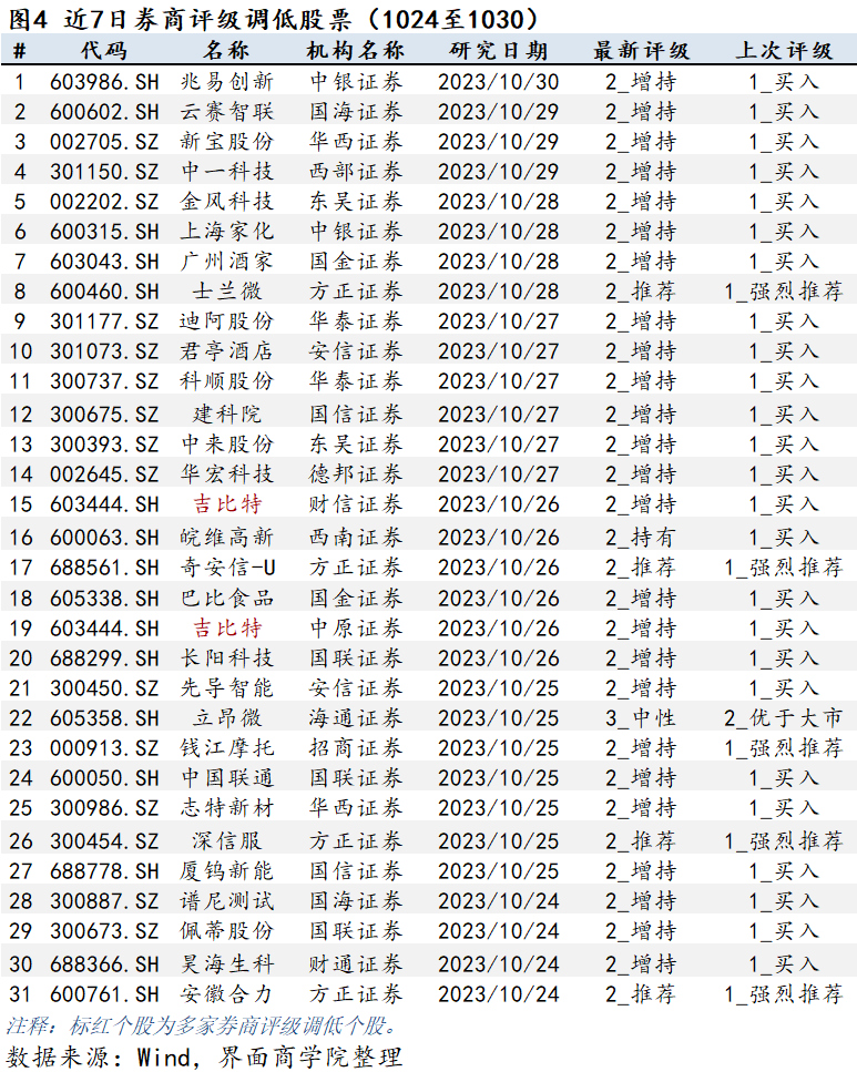上图为券商个股在过去一周的评级下调情况。近7日共有31篇研报对30家A股公司评级进行下调。其中,吉比特(603444.SH)被两家券商下调评级。