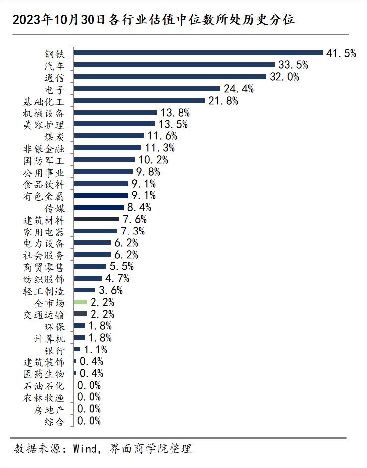 根据申万31个一级行业上看,市场估值处于历史最高分位的三个行业为钢铁、汽车及通信。石油石化、农林牧渔、房地产以及综合4个行业估值创历史新低。