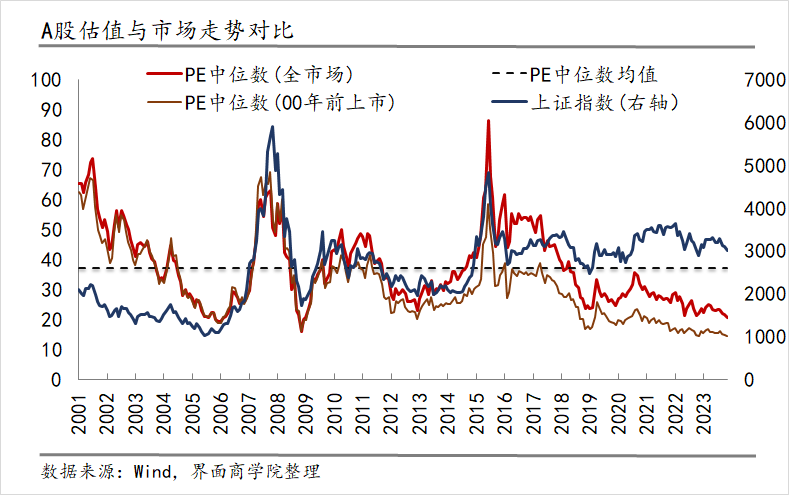 上图中红线描绘了A股当前活跃交易且业绩披露完善的2021年之前上市的全部个股、自2001年起月频P/E TTM中位数的情况。另外,对800家2000年前上市且至今存续的上市公司进行单独统计并以棕线表示,这部分公司具备2001-2021年的全部数据,可以从更完整的周期看到估值的变动情况。