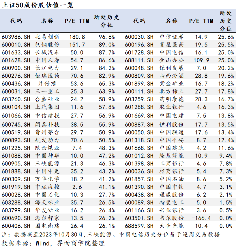 附上证50成分股估值情况。
