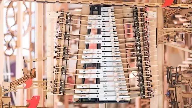这个装置大约3.5米高,由1450个木制零件,180个键组成,有点像一个巨大的风铃。