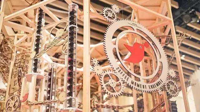 点单结束,等待咖啡的时间里,可以看到这个装置上的一个红色的小球,沿着木制的音阶一路滚落,期间奏出悦耳的音符。直到小球触发红色的“杯子”,演奏结束,咖啡也就做好了。