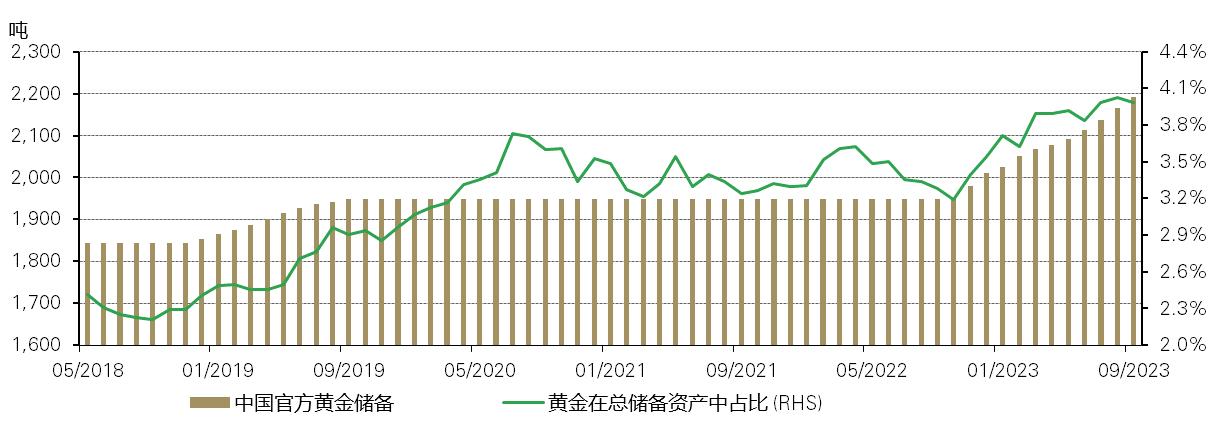 自去年11月中国时隔38个月首次宣布增储黄金起,中国官方黄金储备已连续11个月增加,到今年9月中国央行已增储黄金243吨。以美元计,黄金在中国外汇储备中的占比为4%,持平历史高点。