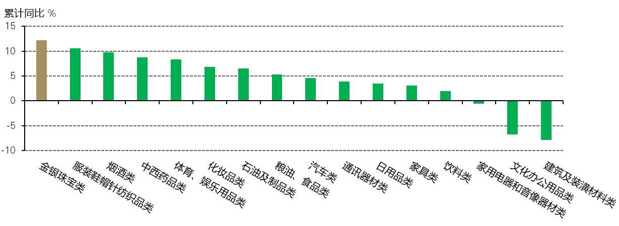 国家统计局数据显示,今年前三季度以黄金为主的金银珠宝类零售总额同比增长12%,领跑其他品类,超过服装鞋帽及烟酒等品类。