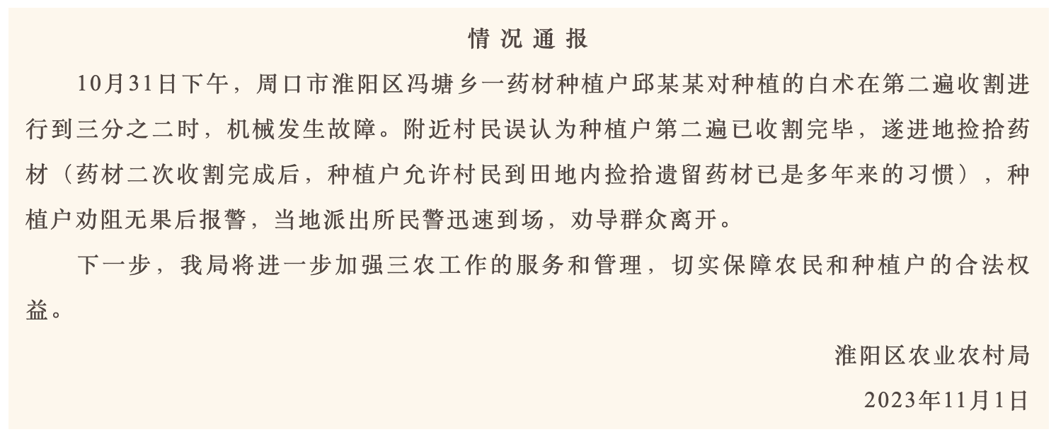据“淮阳融媒”消息,11月1日,淮阳区农业农村局就网传“村民抢中药事件”发布情况通报:10月31日下午,周口市淮阳区冯塘乡一药材种植户邱某某对种植的白术在第二遍收割进行到三分之二时,机械发生故障。附近村民误认为种植户第二遍已收割完毕,遂进地捡拾药材(药材二次收割完成后,种植户允许村民到田地内捡拾遗留药材已是多年来的习惯),种植户劝阻无果后报警,当地派出所民警迅速到场,劝导群众离开。下一步,我局将进一步加强三农工作的服务和管理,切实保障农民和种植户的合法权益。