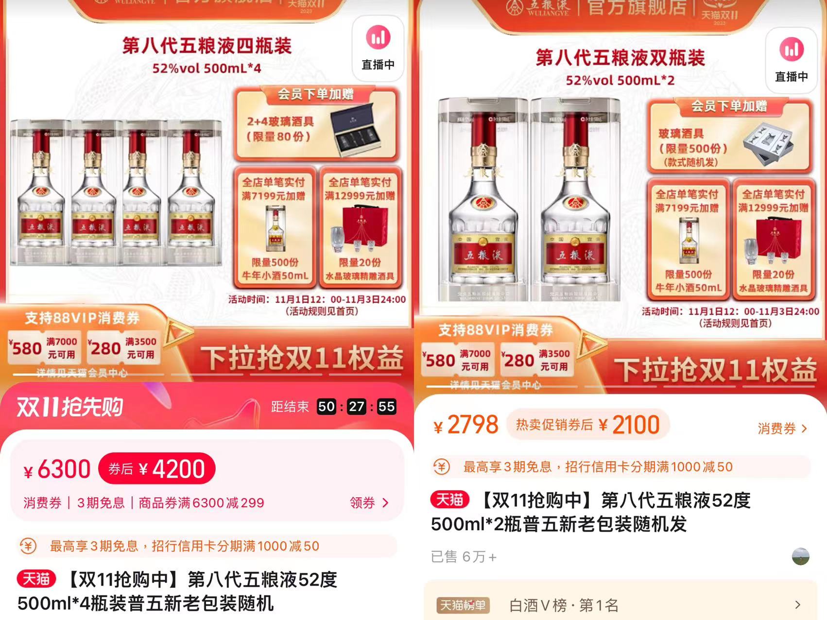 目前,双十一电商节已经开启提前购,在天猫五粮液官方旗舰店,500ml八代五粮液双瓶装仅售2100元,另外叠加不同种类消费券折扣后,价格低于618,几乎与出厂价持平。
