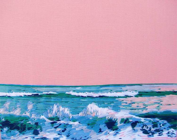 她称自己“用线作画”,艺术家Stephanie Kelly Clark喜欢绣那些比较荒凉的景观,捕获大自然中无言的美。这幅作品中有粉色的天空和浪波,让人想到了太阳落山时的潮汐。