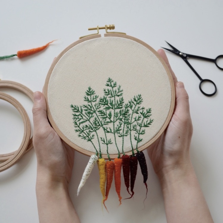 Veselka Bulkan认为除了针和箍结合之外,还可以和毛毡元素结合。她最受欢迎的作品之一就是从箍下面垂下来的多彩胡萝卜。一般是很少看到这种形式,让人有耳目一新之感。Bulkan在她在Etsy Shop的店铺上面卖这个作品和其他相似的蔬菜作品,小草本花束。