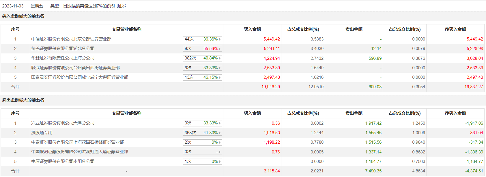 北斗星通11月3日涨停,全天换手率达9.94%,振幅达8.07%。龙虎榜数据显示,营业部席位合计净买入1.5亿元。其中,中信证券北京总部证券营业部、东莞证券湖北分公司分别买入5449.42万元、5241.11万元;兴业证券天津分公司、深股通专用分别卖出1917.42万元、1555.46万元。
