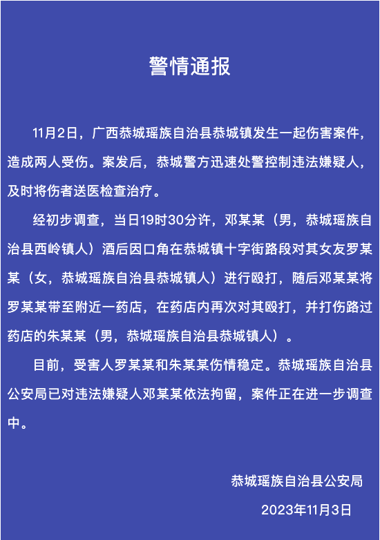 经初步调查,当日19时30分许,邓某某(男,恭城瑶族自治县西岭镇人)酒后因口角在恭城镇十字街路段对其女友罗某某(女,恭城瑶族自治县恭城镇人)进行殴打,随后邓某某将罗某某带至附近一药店,在药店内再次对其殴打,并打伤路过药店的朱某某(男,恭城瑶族自治县恭城镇人)。