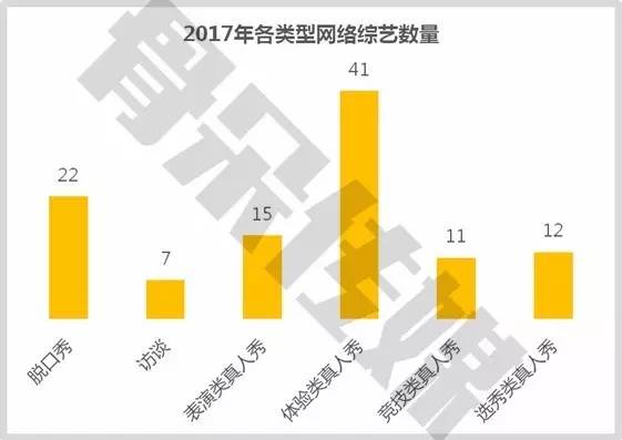 2、2017年网络综艺主体类型不变,以真人秀、脱口秀、访谈三大类为主。体验类真人秀网综市场最火热,其次是脱口秀网综