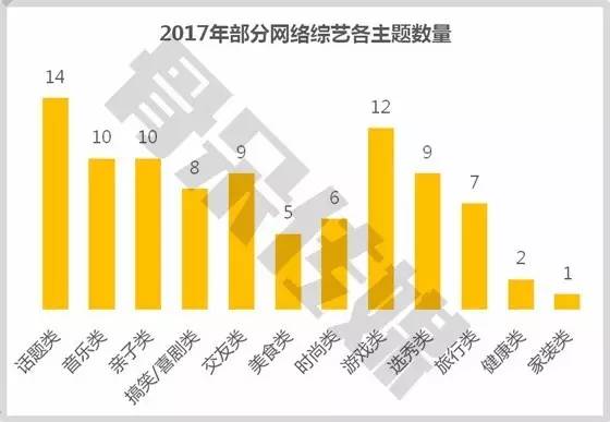生活服务类、亲子类、游戏竞技类、音乐类、交友类主题网络综艺仍是创作主流。2017年,生活服务类主题进一步细分,出现较多“旅行”为主题的网综。此外,喜剧主题类网络综艺发展势头强劲。