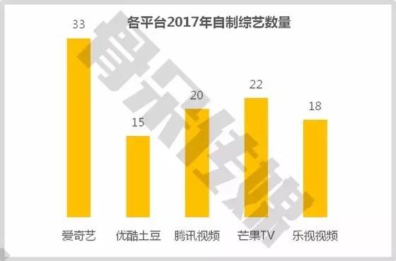 根据各平台公开信息搜集,2017年自制综艺数量预计将达108个。其中,产量位列前三的平台分别为:爱奇艺33部,芒果TV22部,腾讯视频20部。