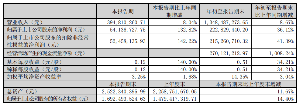 钱江生化2023年前三季度营收约13.28亿元,同比减少1.19%;归属于上市公司股东的净利润约1.4亿元,同比增加7.41%。