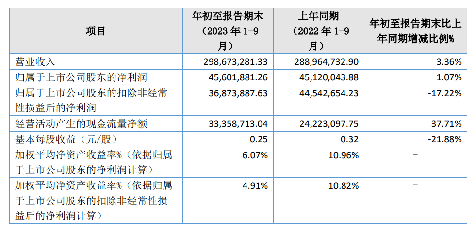 另一家营收与利润双增的绿亨科技2023年前三季度实现营业总收入2.99亿元,同比增长3.36%;归属于上市公司股东的净利润4560.19万元,同比增长1.07%。