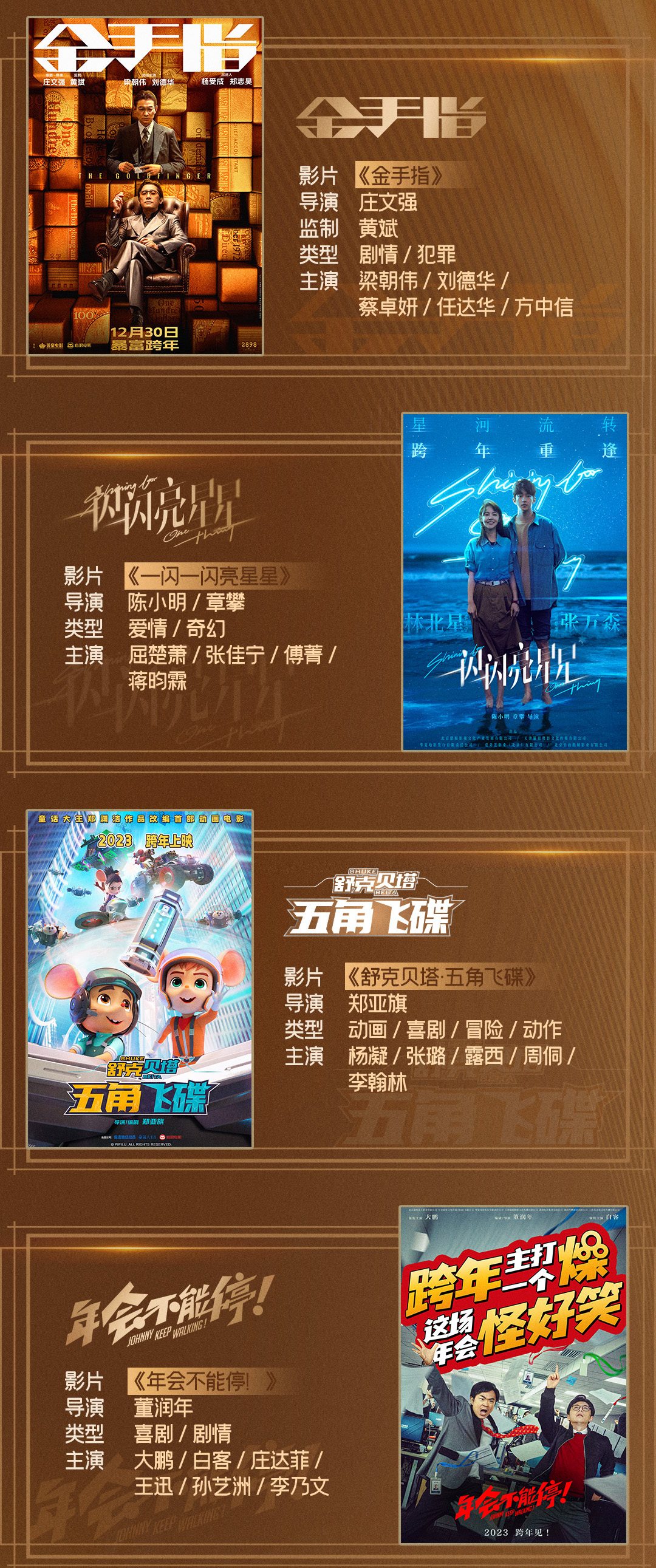 《金手指》《一闪一闪亮星星》《年会不能停》《舒克贝塔·五角飞碟》都定档于12月30日。其中,改编自真实案件的犯罪剧情片《金手指》由庄文强担任编剧和导演,梁朝伟、刘德华主演。爱情电影《一闪一闪亮星星》延伸自同名网剧,该剧是爱奇艺首部播放热度破亿的分账网剧。由原班人马带来的电影《一闪一闪亮星星》目前是2023年待映影片中想看数据第一。《年会不能停》则是喜剧片,集结大鹏、白客等主创,聚焦打工人的故事。《舒克贝塔·五角飞碟》是猫眼电影在贺岁档对于儿童动画方面的布局,该片改编自郑渊洁小说,由郑亚旗执导并编剧。