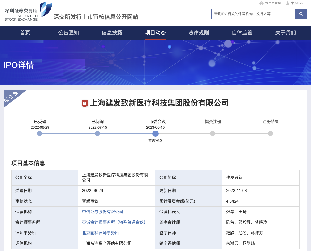11月6日,深交所发行上市审核信息公开网站显示,上海建发致新医疗科技集团股份有限公司IPO事项审核状态变更为暂缓审议。