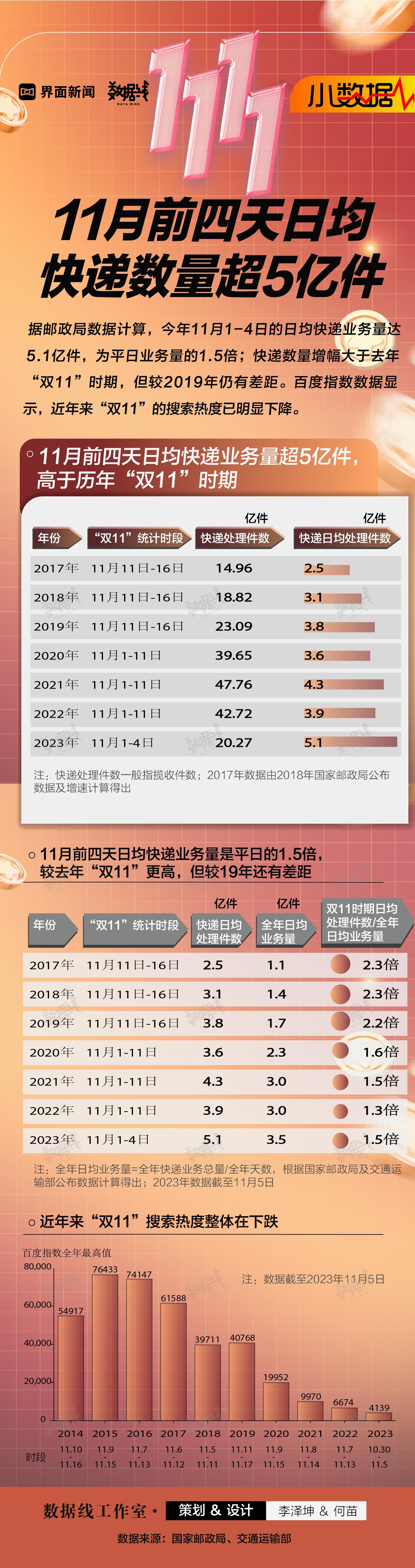 11月1-4日日均快递数量5.1亿件,为平日快递业务量的1.5倍,增幅高于往年“双11”时期。