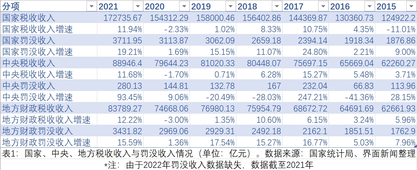 通过梳理国家统计局和各地人民政府公开数据(表1),界面新闻注意到,2015年到2021年期间,从国家、地方财政两层面来看,罚没收入都保持了高于税收收入的增速。特别是在2019年地方税收收入增速只有1.35%的情况下,罚没收入增速达到17.54%,高出16个百分点。虽然中央罚没收入远低于地方,但在2021年中央罚没收入增速也高达93.45%。在2015年和2020年,政府税收收入负增长的情况下,罚没收入仍在逆势增长。