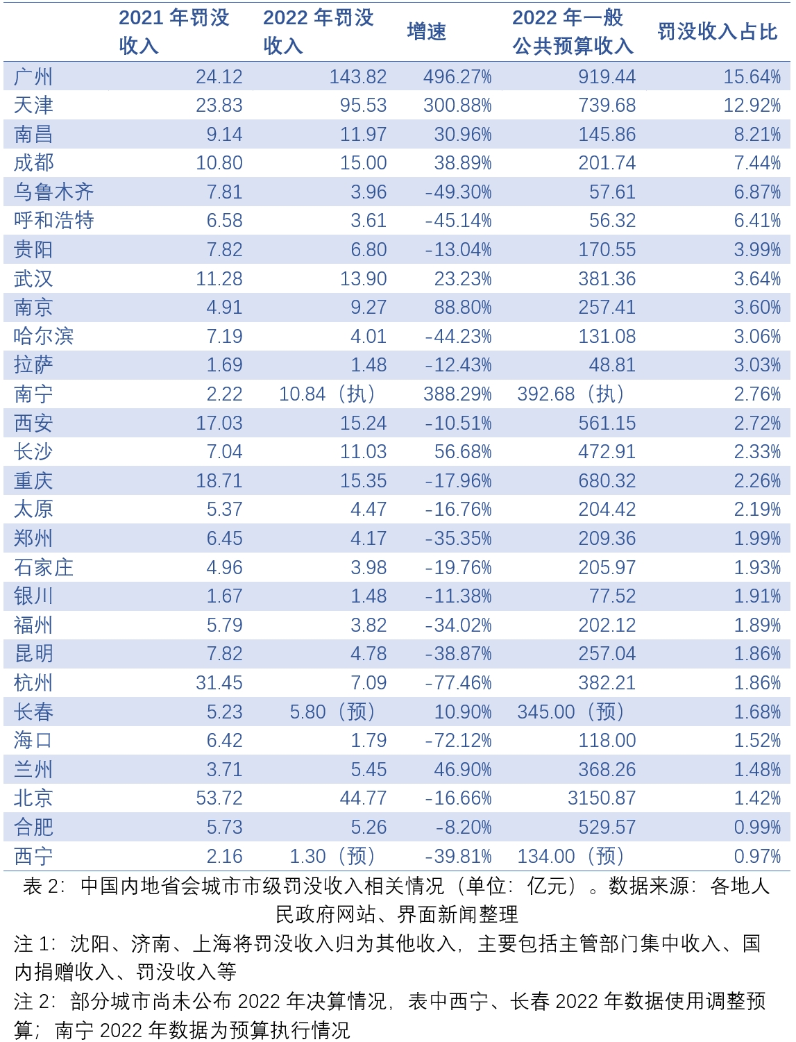 通过中国内地省会城市公布的罚没收入来看(表2),有半数以上(17个)省会城市2022年罚没收入的增速有所下降,但仍有一些城市呈现出高增速态势,其中广州市增速达到496.27%,天津市增速达到300.88%,南京市增速为88.80%。同时,广州与天津两市的罚没收入占比也位居全国前两位,分别为15.64%和12.92%。