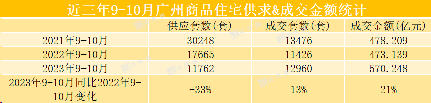 从成交数据来看,根据克而瑞最新数据监测,今年9-10月,广州商品住宅供应量为11762套,同比下降33%;成交达到12960套,同比增长13%;成交金额570.248亿元,同比增长21%,创下近三年新高。