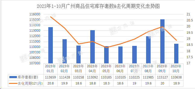 在库存方面,广州楼市目前仍存在不小的压力。虽然在新政利好的刺激下,10月份全市商品房库存降至11.06万套,去化周期缩短至18.9个月,但依旧比行业警戒线(12个月)高出不少。