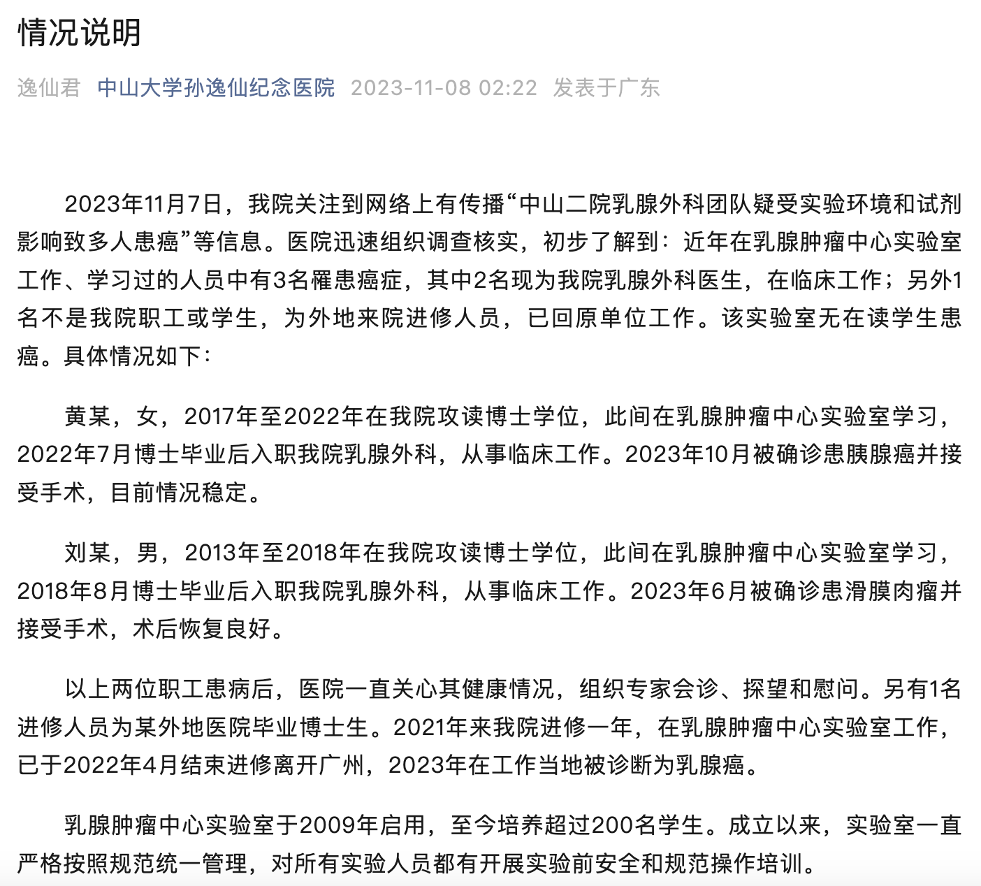 11月8日2时22分,中山大学孙逸仙纪念医院(下简称:中山二院)于官方微信公众号公告“中山二院乳腺外科团队疑受实验环境和试剂影响致多人患癌”情况说明。