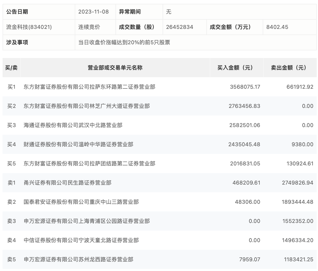 11月8日,流金科技今日涨26.05%,全天换手率达11.46%,振幅达31.8%。龙虎榜数据显示,营业部席位合计净买入421.28万元。其中,东方财富证券拉萨东环路第二证券营业部、东方财富证券林芝广州大道证券营业部分别买入356.81万元、276.35万元;甬兴证券有限公司民生路证券营业部、国泰君安证券重庆中山三路营业部分别卖出274.98万元、189.34万元。