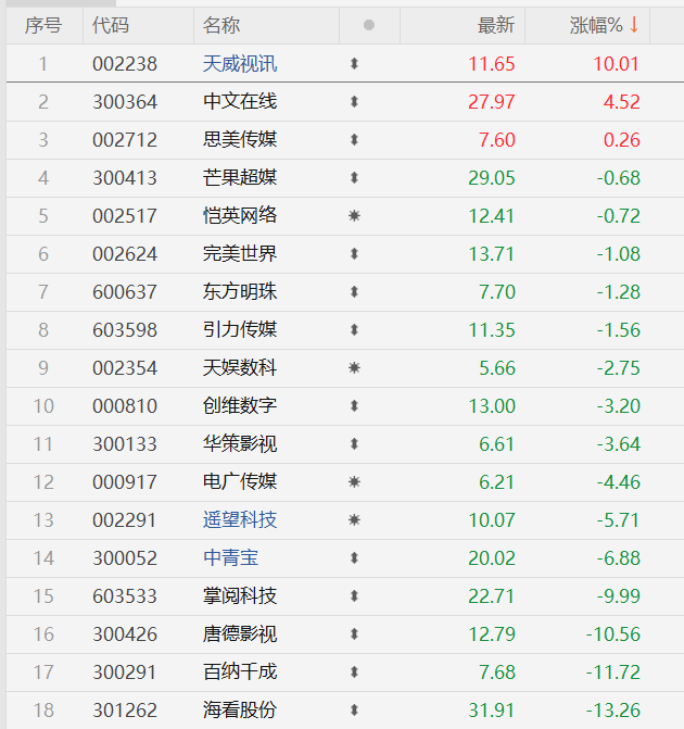 11月9日,短剧概念股结束了连续多日的爆发,整体跌多涨少。截至收盘,iChoice的18只短剧概念股仅有三只上涨,其余下跌。天威视讯(002238.SZ)涨停,斩获六连板,市值增加了41.03亿元;中文在线涨4.52%,过去六个交易日大涨103.57%;思美传媒(002712.SZ)微涨0.26%。
