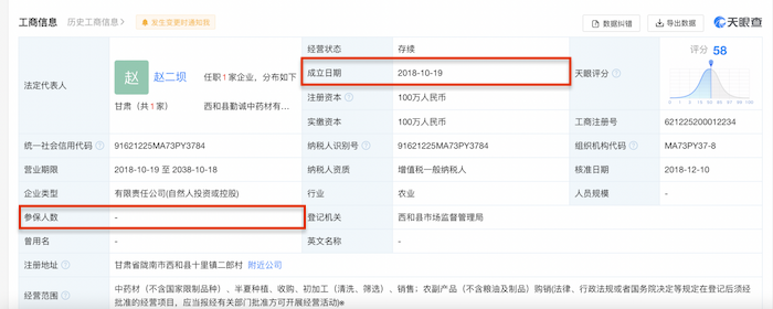 此外,天眼查显示,新荷花2019年第三大供应商——西和县勤诚中药材有限责任公司(下称:勤诚中药)成立时间较短,2018年10月19日才成立,且参保人数为0;新荷花2017年第二大供应商绵阳市腾源中药材有限公司已注销。