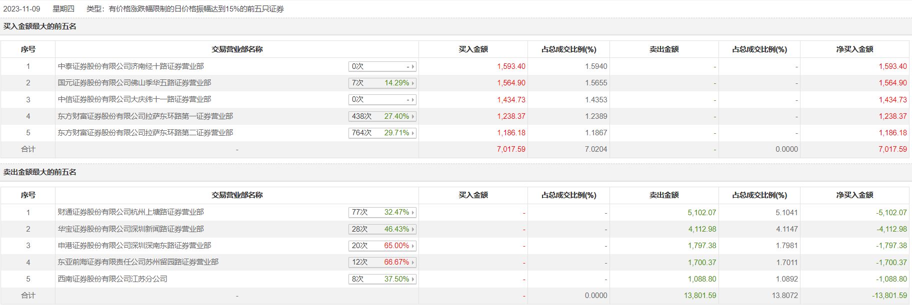 凯众股份11月9日跌9.37%,全天换手率达28.35%,振幅达19.95%。龙虎榜数据显示,营业部席位合计净卖出6784.01万元。其中,财通证券杭州上塘路证券营业部、华宝证券深圳新闻路证券营业部分别卖出5102.07万元、4112.98万元;中泰证券济南经十路证券营业部、国元证券佛山季华五路证券营业部分别买入1593.40万元、1564.90万元。