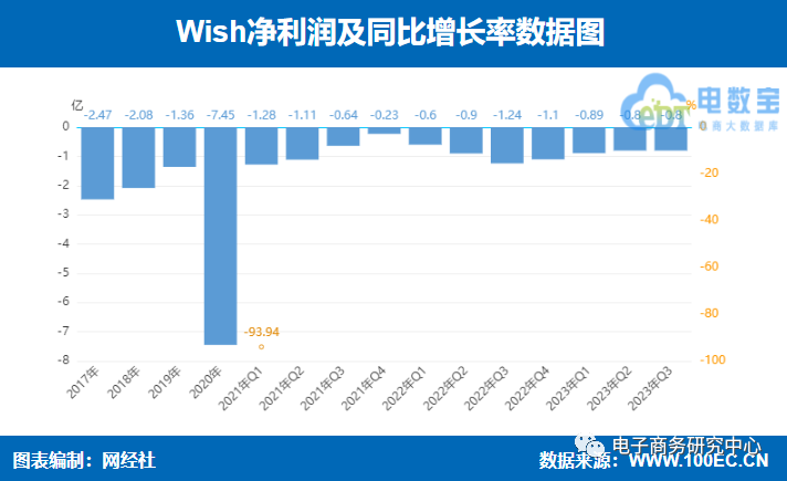 2022年,Wish营收5.71亿美元,同比下降72.61%;净亏损达3.84亿美元。在2021年度,Wish营收20.85亿美元,同比下降18%,亏损则达到了3.61亿美元,经营活动产生的现金流为负4900万美元。从2017年以来,Wish净利润均为负,已连续亏损七年。