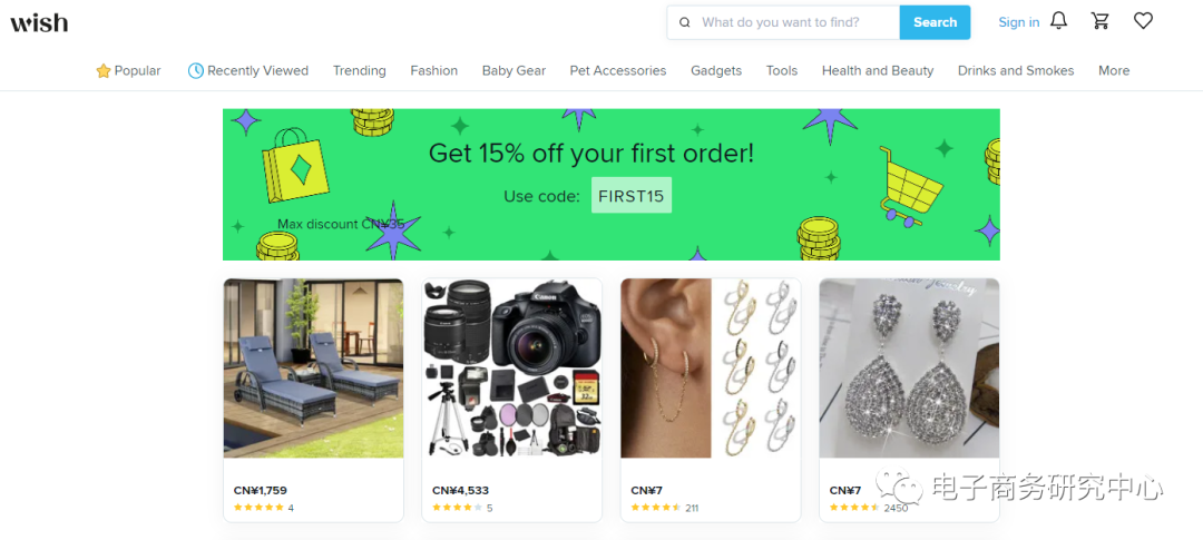 据介绍,Wish于2010年在美国硅谷成立,最初只用于收集和管理商品的工具。2013年,Wish正式进入跨境电商领域,开始往购物APP发展。该平台提供低价打折商品,包括廉价的家居用品和服装,以及电子产品和玩具,相对于亚马逊等电商平台,消费者在Wish更能找到实惠的产品,这也是Wish最大的优势。