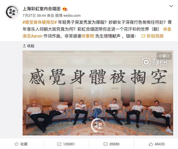 大概不少人对于彩虹合唱团的认知,最早来源于7月下旬合唱团的作品《感觉身体被掏空》,期间刚好“葛优躺”普遍代表了部分年轻人的“生活心态”;因为吐糟和自娱自乐把合唱团的推到了风口浪尖。