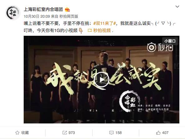 3个月之后,天猫 携手上海彩虹合唱团在双11唱响《我就是这么诚实》;虽然不知道是这只“合唱曲目”的问题,还是双11本身的天时占据了太多用户的眼球,以至于《我就是这么诚实》的上线竟然没有在微博、在朋友圈掀起半点涟漪。