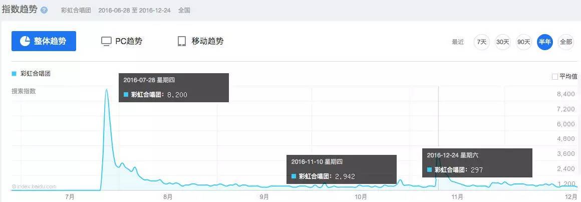 以上这张百度指数图上的两个时间节点,以及合唱团平时的搜索指数,可以预见彩虹合唱团其“标新立异”的“内容形式”虽然被大众接受了,但是他所能带来的价值正在被稀释。