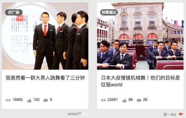 诸如2014年11月因为《INFORMAL EMPIRE》开始蹿火的日本机械舞男团WORLD ORDER(世界秩序),以及2016年1月份因为《张士超你到底把我家钥匙放在哪里了》开始爆红的彩虹室内合唱团。