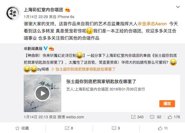 自新闻晨报在微博“首发”之后,像是新浪娱乐、文艺上海、微博音乐、江南晚报、好奇心日报,哔哩哔哩弹幕网等都有转发,甚至连人民网、网易云音乐、奥地利音乐频道也没有放过;