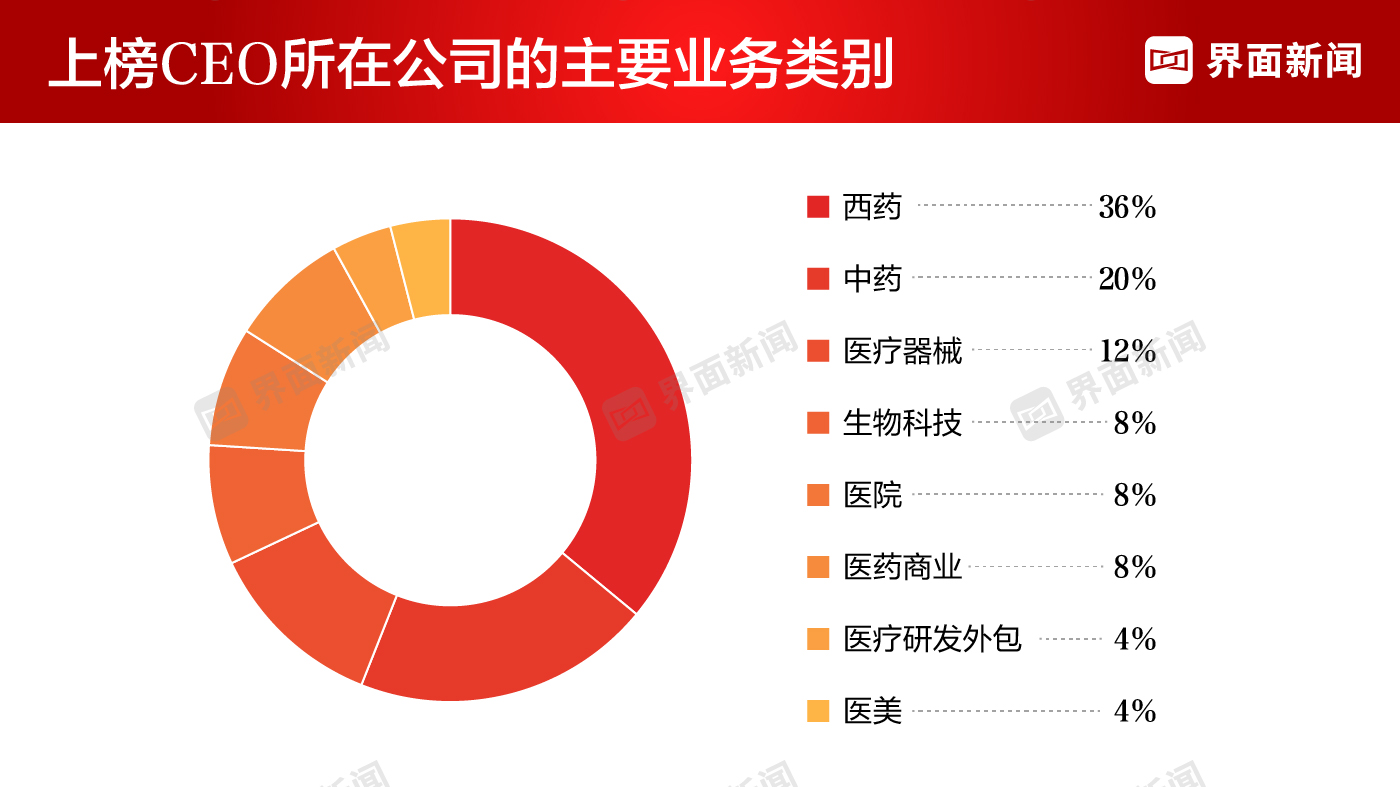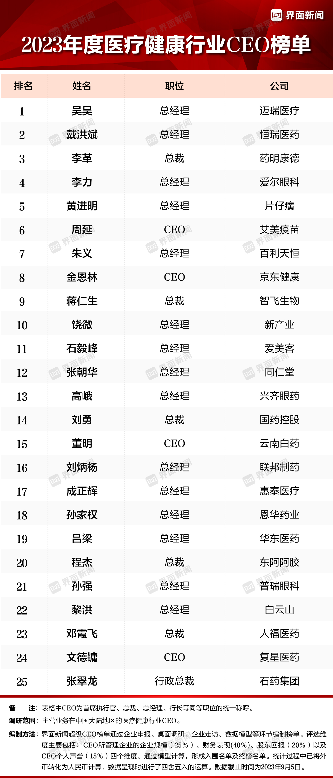 本篇中CEO为首席执行官、总裁、总经理、行长等同等职位的统一称呼。我们的研究面向中国地区医疗健康企业CEO。界面新闻超级CEO榜单通过企业申报、桌面调研、企业走访、数据模型等环节编制榜单。评选维度主要包括:企业规模(25%)、财务表现(40%)、股东回报(20%)、个人声誉(15%)四个维度。通过模型估算,形成入围名单及终榜名单。统计过程中已将外币转化为人民币计算,数据呈现时进行了四舍五入的运算。