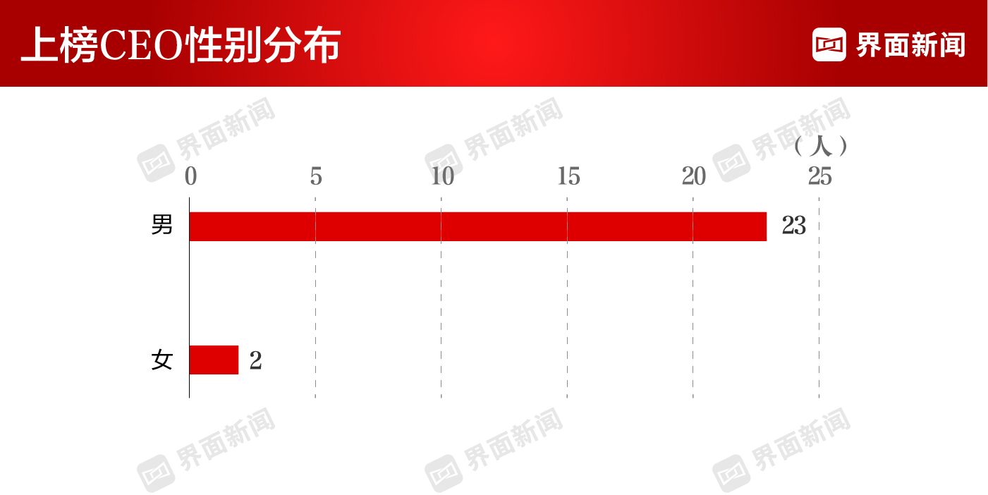 上榜的25位CEO平均年龄54岁,其中最年轻的当属京东健康的金恩林和普瑞眼科的孙强,今年同为42岁。上榜CEO中共有2位女性,她们分别是同仁堂总经理张朝华和兴齐眼药总经理高峨。