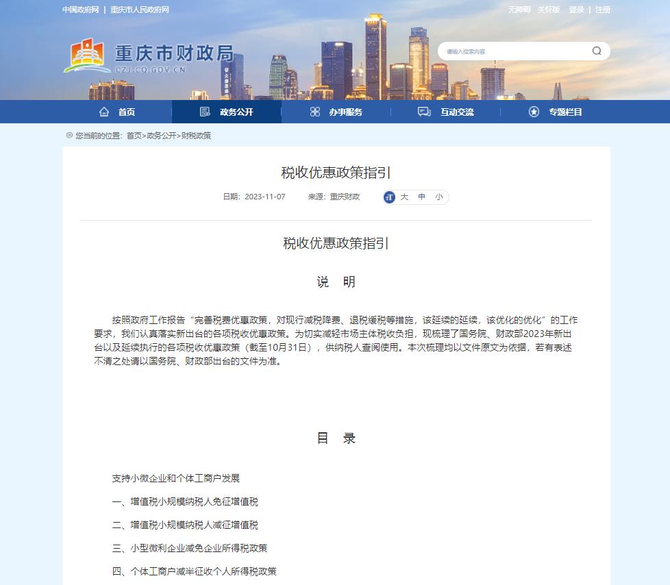 近日,据重庆市财政局发布《税收优惠政策指引》,为切实减轻经营主体税收负担,重庆市梳理了国务院、财政部2023年新出台以及延续执行的各项税收优惠政策(截至10月31日),供纳税人查阅使用。